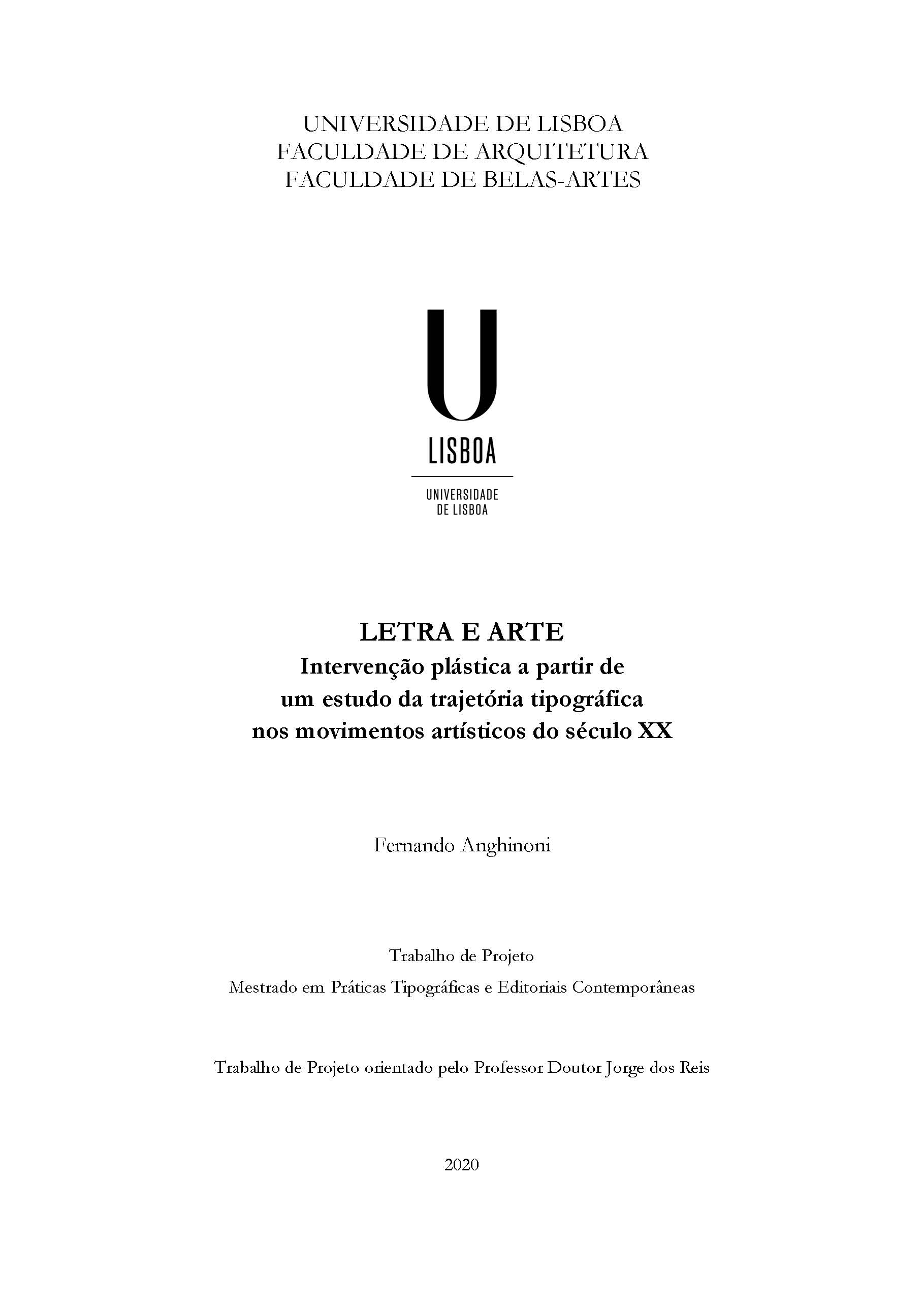 This Project Work aims to discuss and understand the importance of typography in visual arts and its relationship with the emerging cultural movements of the 20th Century. It starts with an analysis of the early decades, and the appearance of so-called modern typography, as well as the use of collage techniques in artistic works. Following that, the discussion moves on to the advent of typographic poetry and its contribution to the renewal of the art of writing during this period, especially in what regards the transformation of language into image; also, the cultural phenomena affected at the end of the century by the inclusion of typography in contemporary art will be under analysis. One of the main theses of this Work supports the idea of combining elements, using verbal and visual codes, and reflecting on artistic movements, and their historical origins, that involve the universes of collage, typographic poetry and arts. This is done by observing and studying how the ideologies of the beginning of the century tended to break paradigms, something borne fruit from the need for a socio-political and cultural redefinition, a factor that became a mainstay thereon in the practice of art, and ended up infiltrating and reshaping several artistic, with typography as a fundamental guideline with which to legitimize these new trends. Finally, after completion of the theoretical research, a practical physical project will be carried out and presented, in which some intervention typographic and prints techniques applied on paper and fabric. The will culminate in an exhibition of works created during the graduate research period, representing an empirical proof of concept that will serve as a proper conclusion of the work presented here.