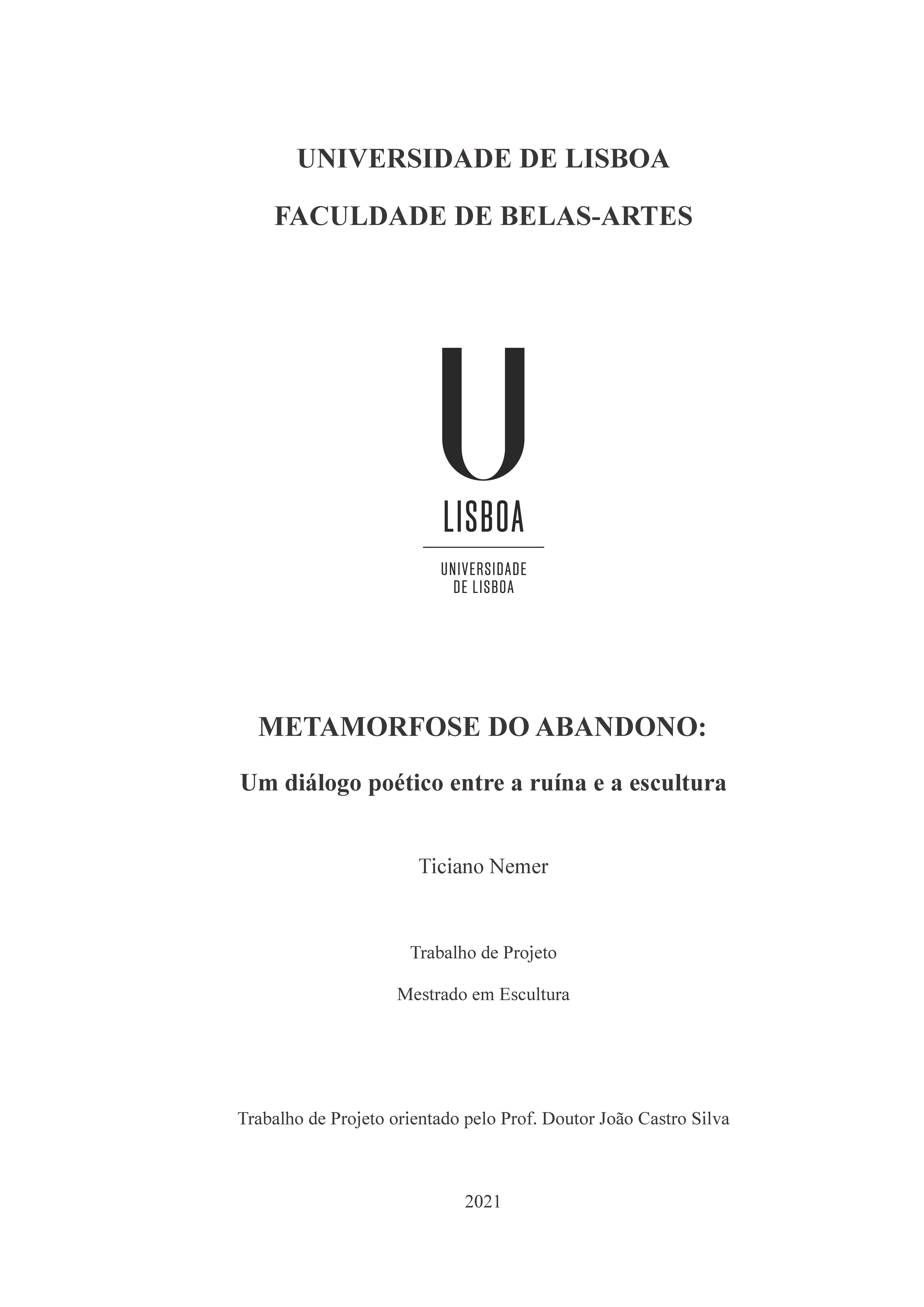 We live in a time marked by intense political, economic, social, environmental and pandemic crises. In this scenario of destruction and catastrophe, ruin has been gaining a leading role within contemporary artistic production. This project work proposes a reflection on the dialogue between art and abandonment. The objective is to investigate the phenomenon of the interpretation of the ruins in the current sculptural panorama, as well as to understand their reflections in the artistic poetics of the author himself. This qualitative research, of a theoretical-practical nature, is divided into two distinct phases, but connected by the guiding thread of abandonment. In the first stage, of theoretical character, the problem of ruins is approached under a historical, anthropological, sociological, philosophical and artistic view, deepening above all in its relationship with the contemporary sculptural universe. In the second phase, of practical character, the artistic praxis of the author performed during the Master's degree in Sculpture is presented, entitled "Metamorphosis of Abandonment". It isintended to connect it procedurally, conceptually and aesthetically with theoretical reflection, in a complementary and conclusive way. From the study of this important segment of modern aesthetics, we seek to contribute to scientific and artistic growth, advancing in theory, proposing new discussions and deepening concepts and practices. The investigation concludes by noting the importance of ruins for the construction of the poetic imaginary of artists throughout history and the great contribution brought to the theme by sculpture in contemporary times.