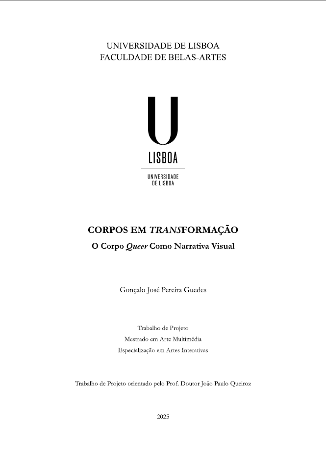 Bodies in transformation: The Queer Body as Visual Narrative explores the body as a space of resistance, metamorphosis, and freedom, connecting queer theory and digital artistic practice. The project takes inspiration from Jesse Kanda's work, whose hybrid and sensual figures oscillate between beauty and the grotesque, intending to investigate bodily transformation as a metaphor for queer experience and as a challenge to gender and identity norms. The theoretical framework contextualizes the project through key thinkers. Simone de Beauvoir introduces the idea that gender is a process of becoming, not a natural essence. Michel Foucault examines biopower and the mechanisms of surveillance that discipline bodies. Judith Butler proposes gender as a repetitive and performative act, capable of subverting social norms. Paul B. Preciado radicalizes this view by presenting counter-sexuality as a technology of liberation, this is, the body as a prosthetic, as a continuously mutating field that redefines pleasure and identity. Donna Haraway's cyborg theory complements this network of ideas, affirming the fusion between flesh and machine as a symbol of posthuman liberation. The practical component, titled Contra-Corpo (Counter-Body), consists of several digitally created 3D images and a vĆdeo with three acts (Awakening, Recoding, and Transmutation), that combines sci-fi aesthetics, bodily sound, and 3D modeling to depict a body transforming beyond the human and the gendered. Ultimately, the project argues that to think of the body as transforming is to think of freedom and the ability to exist outside of norms and to imagine new ways of being. The queer body thus becomes a visual narrative of resistance, creation, and power