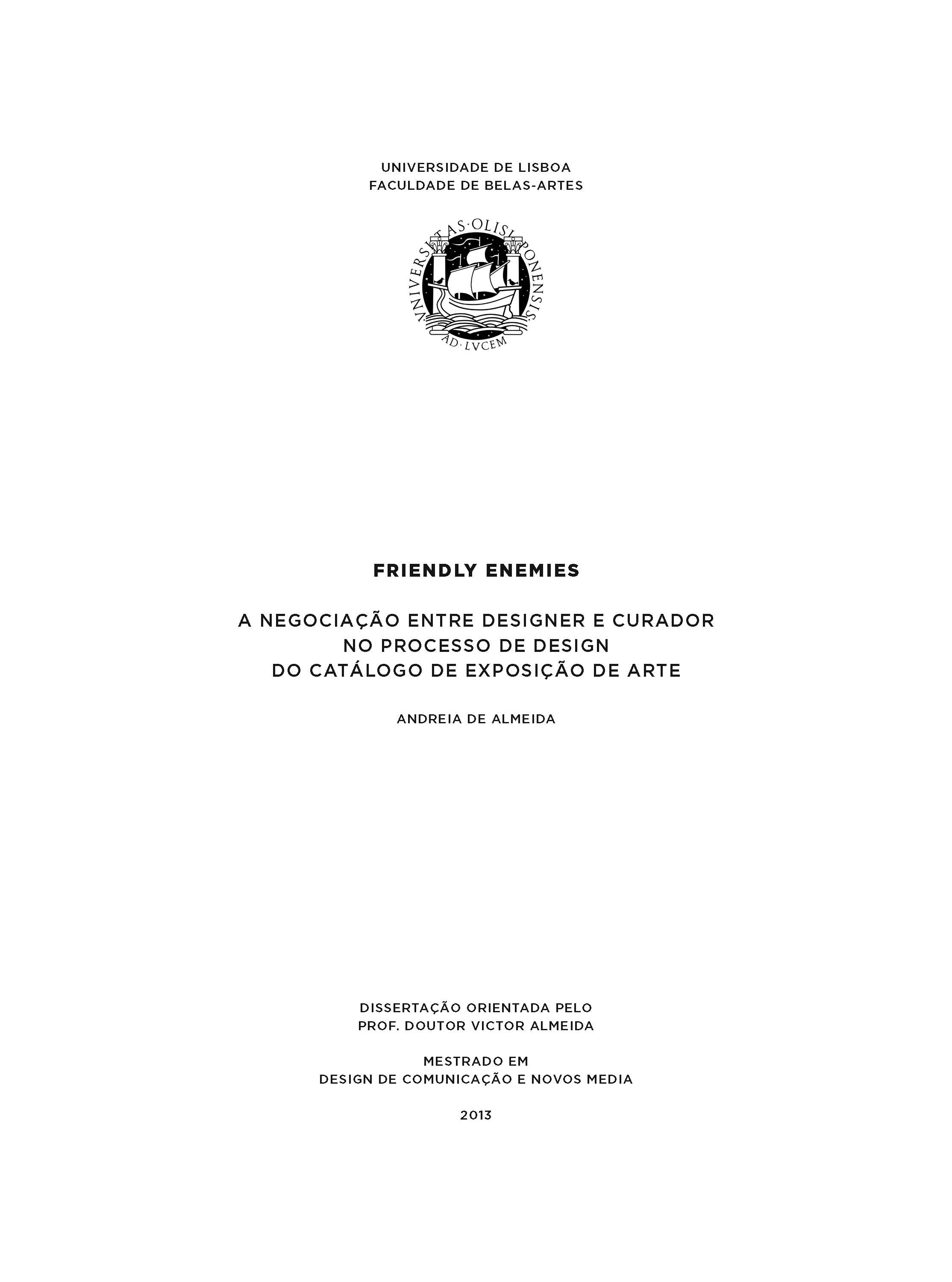 The work developed within the communication design discipline is, often, the result of negotiations between designers and their coun- terparts, even if that interdependence is not consciously established, by the parties involved. In this investigation, the negotiation will be addressed as a struc- turing part of the collaboration process, between designer and curator, during the design of an art exhibition catalogue. In it, we will also exam- ine the various levels – conceptual, procedural and relational – in which the negotiation takes place, in order to observe the different criteria for each case. The main goals will be: to map the interaction, so that we can understand how it is structured; analyze on what grounds each agent negotiates; define the sphere of action of each party; define their limits when it comes to giving up their ideas; list the other agents who influence the decision making and who help to shape the agreement. To this end, we will present three case studies, each one based on the designer/curator relationship within each art exhibition catalogue chosen. In the appendix, the interviews with each designer/curator pair, are fully available. The concluding remarks will emphasize the existence of nego- tiation in all 3 design processes and will show the perception that the various rapporteurs have on: the negotiation; on their own role; on the role of their counterparts. The specific context in which these actors move – the art world – will help to read the collected data