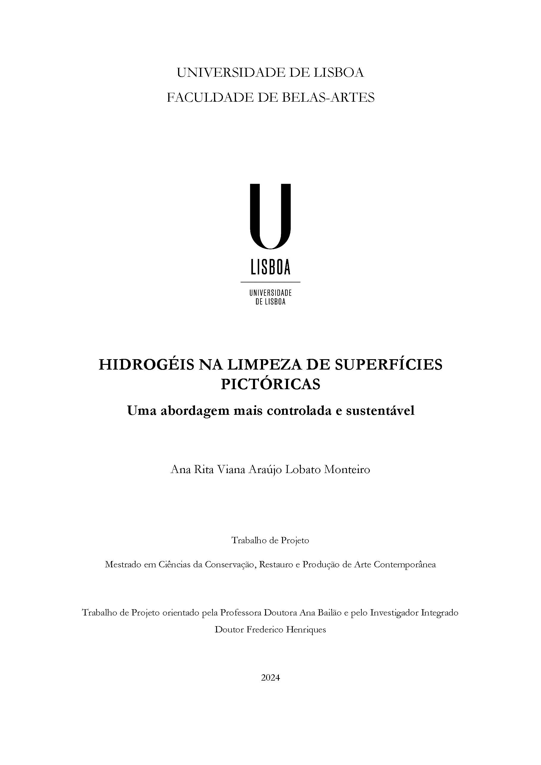 According to Piero Baglioni, hydrogels are a very effective technology for the controlled and non-invasive cleaning of cultural goods. This project focuses on the cleaning of pictorial surfaces, particularly the removal of protective layers (varnishes), using gelled systems, more specifically hydrogels. The research sought to study the characteristics of the polyvinyl alcohol and borax hydrogel, namely the method of preparation, the mechanical, physical and chemical properties, and the behavior after use. The study methodology involved carrying out various analyses and tests on the hydrogel, and two varnished paintings were selected for the application of the hydrogel: two oil paintings on wood, one dating from the 16th century, depicting Saint Helena, and the other, by Manuela Machado, dating from 1959, entitled Saltimbancos. The methodological approach was phased, starting with a bibliographic survey of the history and systems of cleaning in Conservation and Restoration, both of widely discussed principles and those that, being more recent, emphasize the importance of sustainability and the adoption of more controlled and less invasive methodologies in the preservation of cultural heritage. With this bibliographic collection, it was possible to identify the various cleaning protocols implemented in Portugal by the different institutions, making it possible to trace a historical evolution and advance a critical reflection. We went on to characterize the works of art chosen as objects of study, especially their protective layers, as this was an essential step in understanding the composition of the pictorial surfaces that were to be intervened upon and, consequently, ensuring that they were cleaned using the safest and most effective method. After producing and experimenting with gelled systems, the polyvinyl alcohol and borax hydrogel proved to be the most effective and was chosen for cleaning the varnishes and dirt deposited on both paintings.