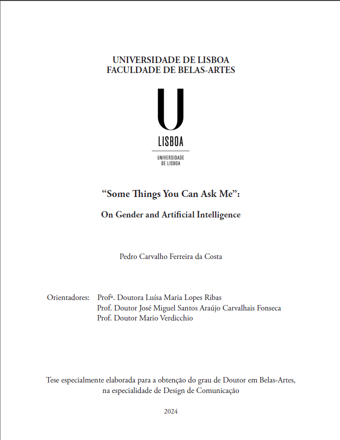 A inteligência artificial constitui atualmente uma componente integrante do quotidiano, nomeadamente através de assistentes digitais cuja ubiquidade tende a passar despercebi-da. Estes sistemas estão a assumir uma postura cada vez mais amigável e preocupada com o nosso bem-estar, afastando-se de uma perceção meramente robótica e de assistência. No entanto, ao atribuir traços humanos a estas entidades, observa-se a presença de caracterís-ticas que tendem a reforçar conceções e estereótipos binários e cis-normativos de género. (…) Este estudo pretende compreender, questionar e explorar a relação entre género e inte-ligência artificial. Foca-se na atual tendência de assistentes digitais serem predominan-temente femininos, especulando sobre as possibilidades de queerizar estas entidades e reenquadrá-las fora de um espectro binário cis-normativo (…).