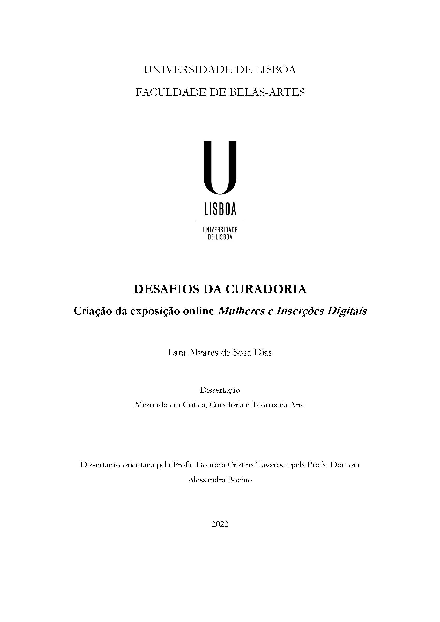 We live in the midst of a society immersed in the effects of digital content technology. One of the issues to think about the actuality arising from this moment concerns the exploration and the tools used in the networked environment, still in parameters based on activities whose first experience came from the real, in the empirical field. It is in the sense of investigation and exploration of this space that this research is applied to the process of online curation, the creation of the website, as an online platform. The project was created as an alternative to nonpresential times, the search for other ways to exhibit through the assembly of the online exhibition Mulheres e Inserções Digitais. The curatorship applied in the network system takes into account the virtual space and in this field, there are countless possibilities for curators to assert themselves in the field of arts. Thus, it is significant to follow a path about this specific practice, the creation of the online exhibition as an alternative support, how it is carried out and the questions it raises.