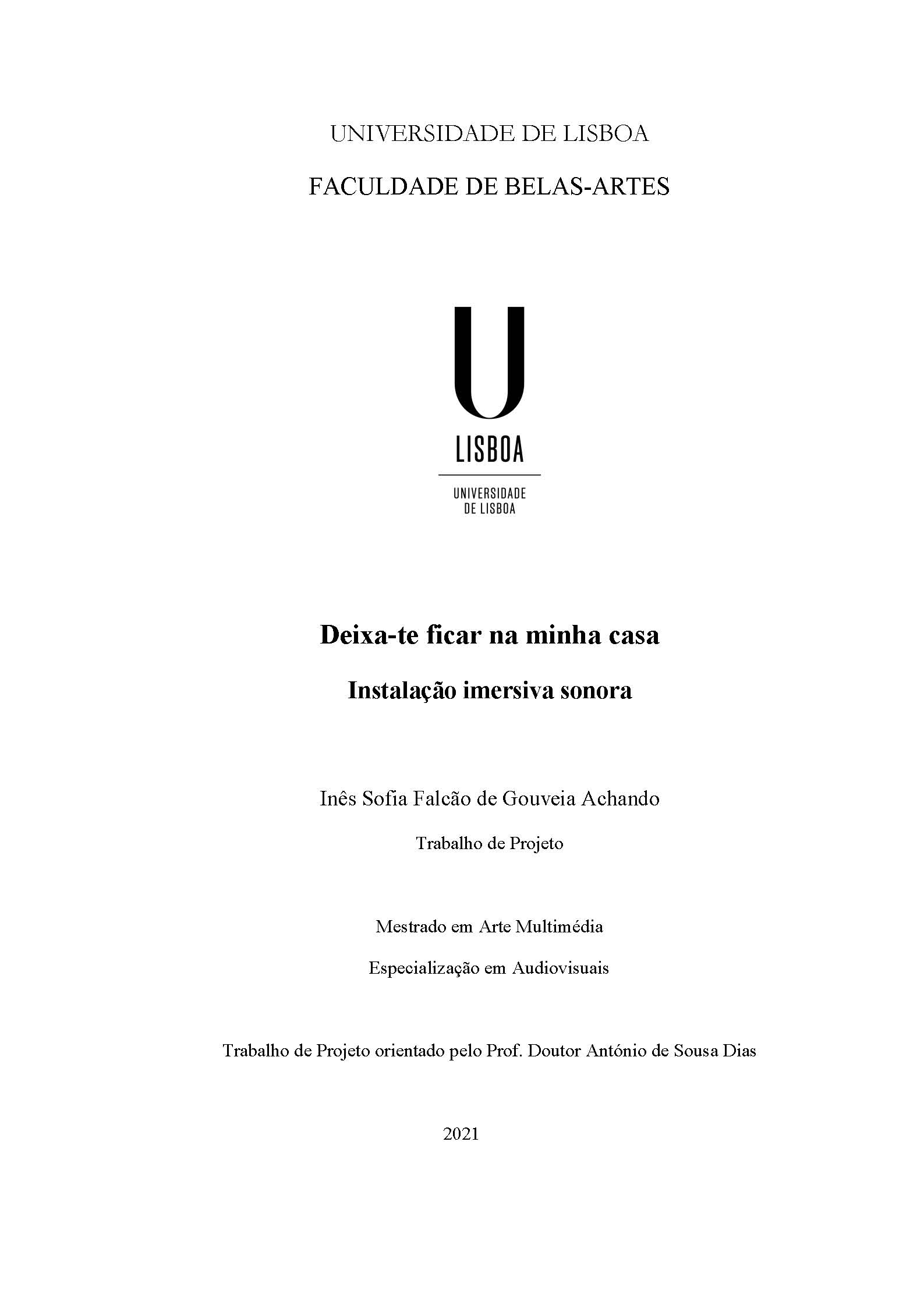Deixa-te ficar na minha casa, aims to transport the sounds of an intimate space to an immersive installation. The house, my house, is the object of study and which I worked on to develop this research and the collection of sound that defines the shape this space. This process results in an installation that proposes to describe a narrative (the memories of this place) and its architectural spatiality (characteristics of this place) through sound design. During the creation of this project, I developed a theoretical research that I present in Chapter 1. The authors and their artworks establish a line of reasoning and discovery of themes that underpin this project, that addressed the issues that arise as the project is designed and requiring more detail due to the plurality of themes it raises. The first part of this research starts from the sound in cinema and from the way sound defines spatiality, through the urban and spatial sound effects and how it influences our relationship with the surrounding environment (sound ambience), how does the reading of these stimuli have a sensory effect in us and in our perception of space. The second part gets closer to the context of this work project and relates the body's sensory perception in space with the consciousness and listening process through this experience of the body in space. Finally, I present a reflection on the relationship between spectator and the work of art where I present a perspective on the position of the viewer towards the artwork, and how people become an actor/actress and co-creator of the artwork itself. The installation Deixa-te ficar na minha casa is a sound experience, where the spectator, from the perspective of a blind eye, enters into a space whose architecture is modelled through sound vibration.