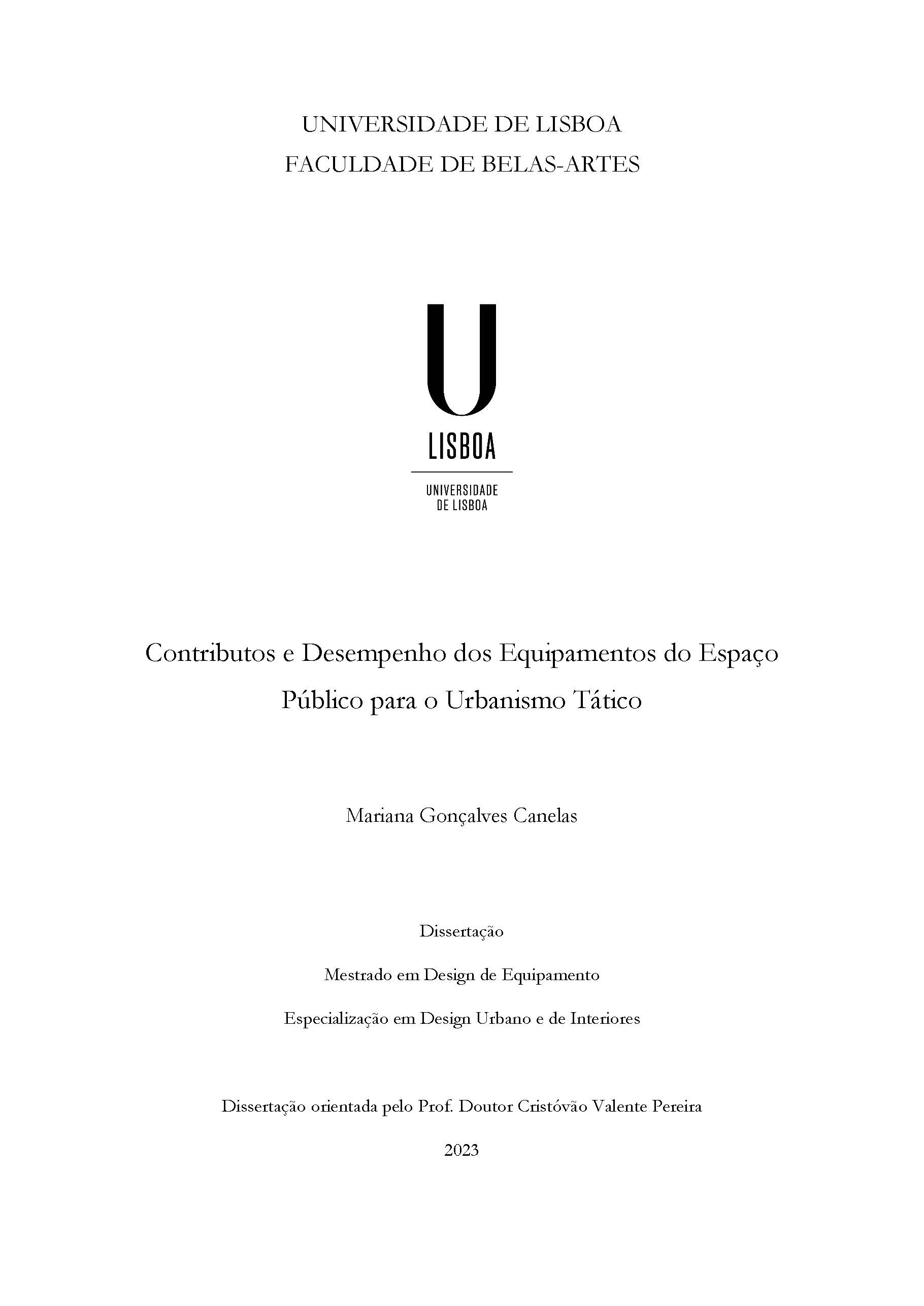 Design de equipamento Urbanismo tático Design urbano Mobiliário urbano Planeamento urbano Sustentabilidade Design ecológico Estudos de caso Pink Street (Lisboa, Portugal) Blue Street (Lisboa, Portugal) Avenida Madame Curie (S. Domingos de Benfica, Lisboa) Rua António Pereira Carrilho (Freguesia de Arroios, Lisboa) Ciclovias
