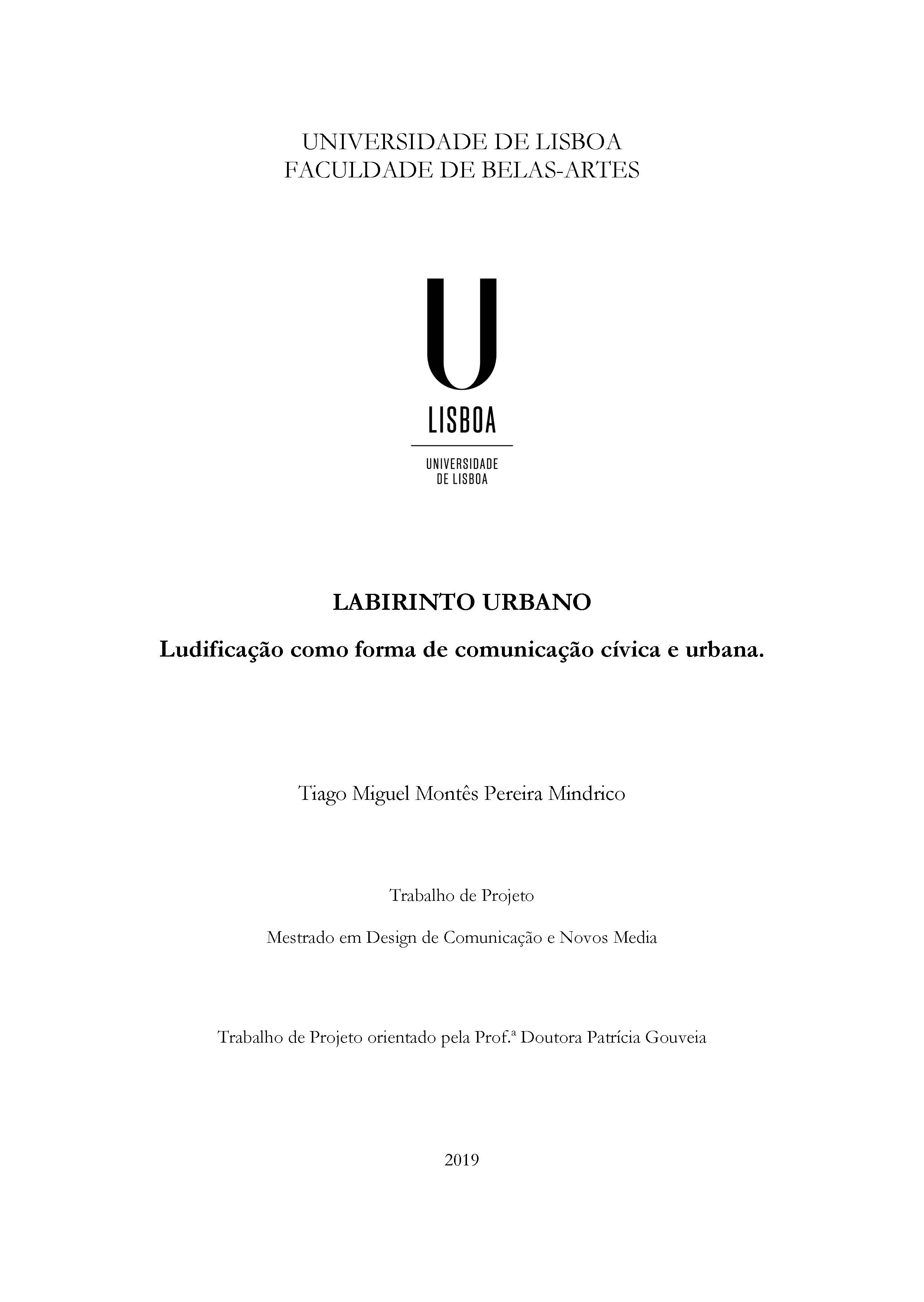 Games and play are significant insofar as they contain a social and human function. In this century, in an increasingly systemic and interconnected society, trials of the insertion of game mechanics associated with everyday events are beginning to gain relevance. Ludification, which is distinguished from gamification because it is a broader concept, offers the possibility of holistically analyzing culture and its daily manifestations through the lens of playfulness. It consists of acts of playfulness appropriating the world and its structures to make them more ambiguous. Its use for a critical purpose, critical play, and communicational, civic media, is analyzed and deepened in the body of the dissertation, in order to offer a globalizing view of its historical development and possible future application. This highlights the disruptive nature of play, and its ability to demystify behaviors, technologies and situations taken for granted. In this dissertation will be presented the project Labirinto Urbano [Urban Maze]. This project, which explores the concept of ludification and how it can be used in the urban and civic communication process, started from an initial research question, how can ludification be used to unlock situations of social exclusion? In this context, it started from the investigation of literature in the area and existing projects to inquire the concept of unitary urbanism in a direction towards the playful city. The investigation culminated in the creation and production of the Labirinto Urbano project, which contributes to a playful language and aims at the practical applicability of the state-of-the-art concepts exposed in the first chapter of the research. Thus, the dissertation LABIRINTO URBANO, Ludificação como forma de comunicação cívica e urbana [URBAN MAZE, Ludification as a form of civic and urban communication], proposes an exploratory methodology, based on arts-based research, in which, theory and practice intermingle into the creation of a concrete project that targets improve of people's lives in public space.