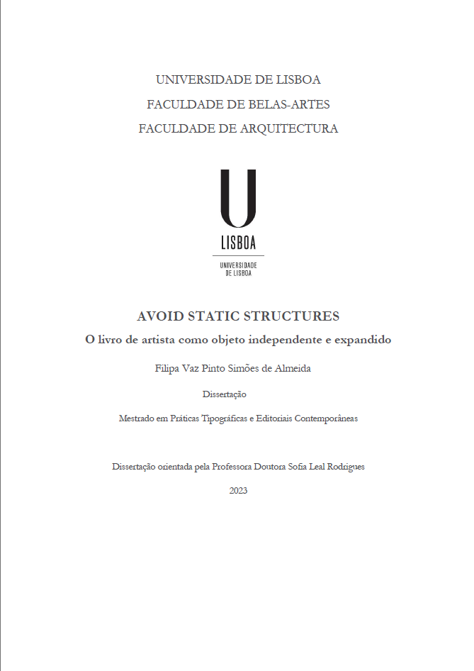 This research project has as its starting point the relationship between contemporary art and related publications. It is intended to explore how the tangent intersections of both disciplines contribute to their practice and expansion in contemporary times. It is also intended to defend that artist's books and author's publications in the arts, in their multiple aspects, are also art objects -autonomous and independent. Born from artistic projects, books can be independent, and vice versa (there are also exhibitions that are born from books). The idea is to explore the importance of these meetings and the projects born together - in art and book publishing. It was important for us to reflect from a historical perspective and, later, a more current one, on the fusion between these two worlds that expand and nourish each other, and to demonstrate how they flow into an expanded field that houses both, insisting on their constant multidisciplinarity and enlargement and, above all, autonomy in the field of publications. The body of this project is divided into two phases: a theoretical one in which an international and national historical contextualization of the birth of the book as an artistic practice is carried out, intending to defend its autonomy as an art object; and a practice one - the realization of an experimental project of curatorship and editorial design, in an exhibition curated by the author and in the elaboration of three publications with the artists, which are interpreted as autonomous and independent objects, as artistic pieces that expand the exhibition , instead of cataloguing or documenting it; going through all the steps of work and collaboration that the process implied, and inhabiting these places as a source of discovery and knowledge in the field.