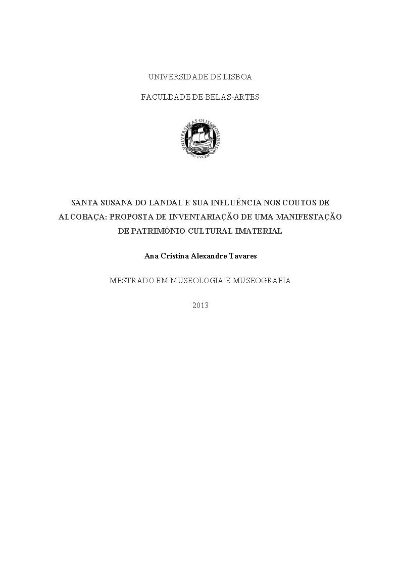 This dissertation focuses on a specific manifestation of an intangible cultural heritage (PCI) in the context of social practices, rituals and festive events that can be found in the central/ western part of the country: the worship of Santa Susana in Landal, which is part of the field of activity of Museology and Museography, both included in the field of study of this masters course. Law nº107/2001 of 8 September which lays down the basis for the policy/scope of the scheme of protection of intangible cultural property and whose safekeeping is based on its “record” for future reference in title VIII, article 91º and following provides for the enhancement of cultural heritage, going beyond the framework of the portuguese law for museums that defines the concept of a museum and what its functions are. The latter refers namely to the integration of collections and includes the representation of existing realities as well as the inventory file. By studying all the aspects connected to the cultural goods of museums such as their history, description, location and associated documentation we are already crossing the line into the field of the immaterial, thus implicitly showing the need that museums feel to contextualize the object. As museums are responsible for the safeguarding of the cultural heritage, their mission is not limited to the conservation of the objects that are kept in their collections, as we can see in the above- mentioned legislation. We propose the establishment of an inventory of the cult of Santa Susana of Landal with a view to its subsequent recognition and ownership by the population and all those interested in this subject, based on research that we have developed to look for the origins of this manifestation on the scope of PCI. We have elaborated an inventory of the cult mentioned above following the conditions of the legislation in force ,as well as the PCI matrix, an information system developed and directed by Direção-Geral do Património Cultural ( General Directorate of Cultural Heritage), which acts as a basis for the National Inventory of Cultural Immaterial Heritage. After having proposed to make an inventory in order that all this cultural manifestation doesn’t fall into oblivion-mainly in the geographical area that originated it- and to get future testimony among interested public, we present furthermore a project for the operation of a sub do-main, that is, a website associated to the Western Digital Website run by the Industrial Association of the Western Region (AIRO),whose main office is located in the region of the documented cult so that this one will be maintained, publicized regionally and that it will also involve the community