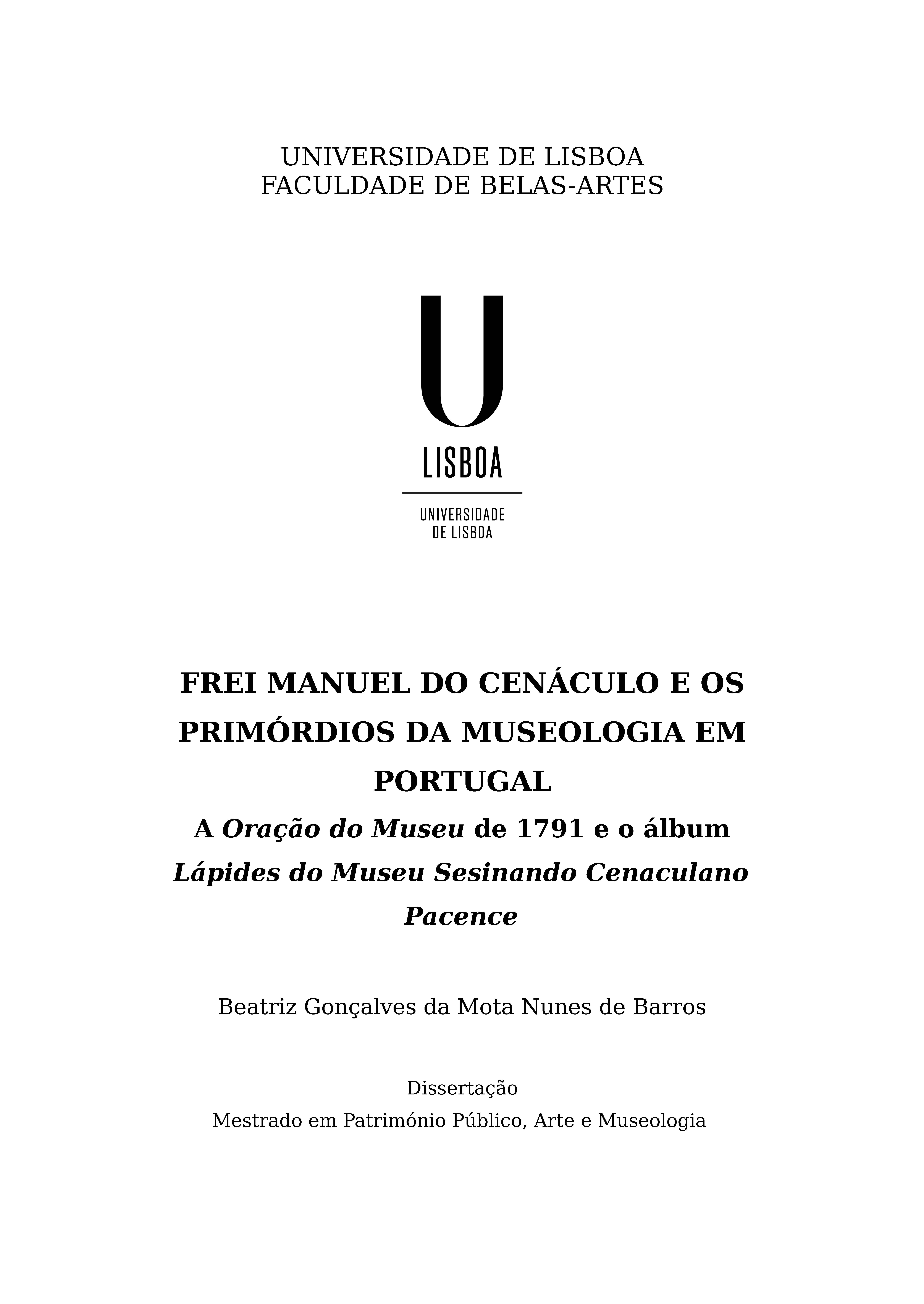 D. Frei Manuel do Cenáculo is an exceptional figure from the Portuguese 18th century. Along his life he was guided by the ideals of the Enlightenment, featuring always a pedagogical side in all his actions. His great life project was to endow the country with Libraries and Museums, necessarily open to the public. It was only at the end of his life, as archbishop of Évora, that accomplished his goal. He was, however, a compulsive collector, creating valuable collections of books, ancient coins, paintings, archaeological artifacts and historical natural objects. Before being appointed as archbishop, Cenáculo was bishop in Beja. There he created the Museu Sesinando Cenaculano Pacence, where he deposited part of its collections, notably a epigraphic section from the archaeological collection. The measures he took related to the creation of this Museum, open to the public in 1791, give him a proeminent role in the beginnings of the Portuguese museology. The date was celebrated with the deliverance of an Oração (which is in fact based on an older one). There was a document that can be referred to as a an early catalogue, with exact drawings of the artifacts, their origins and dimensions, which was called Lápides do Museu Sesinando Cenaculano Pacence. In this thesis, these documents are jointly analyzed, including a transcription of the Oração do Museu from 1791 and an inventory that compiles information relative to the artifacts presented in the catalogue