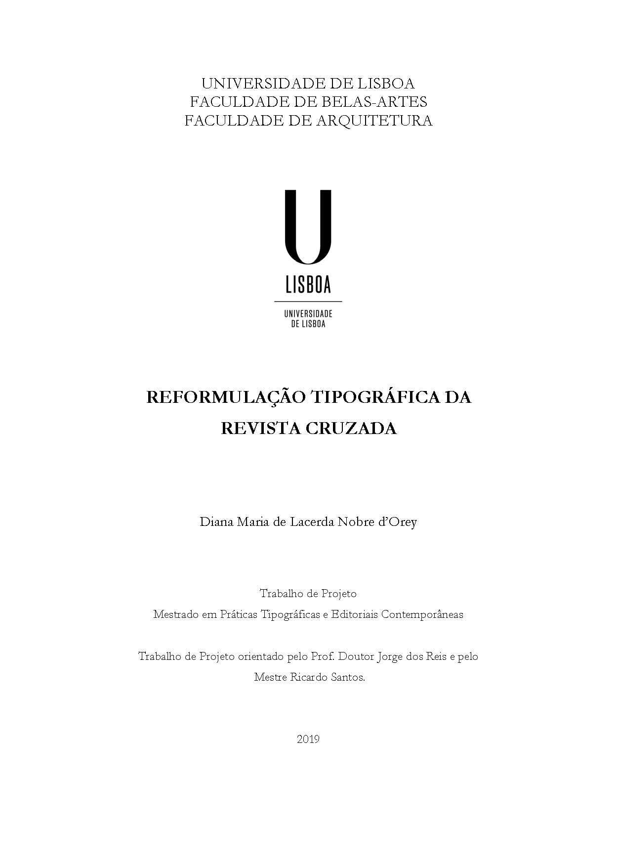 In this Project we intend to know and understand the letter as a means, how its shapes reveal and communicate, by focusing in “Cruzada” magazine as a (physical) support on Catholic Church service, and reform its letters, as shapes, with what communicates its content. A way to comprehend these shapes as a potential, will be throughout na understanding roots of some mundane and common expressions that we will be able to know the development and evolution of letters form the dawn of communication to the shapes and means in use on the present century. This will lead us to an idea that starts within thoughts before it is represented and the importance of a process conjugated in gerund, that is to say, in the eyes of the Roman Catholic Church, a process that deals with these shapes as a result of a relationship. It will be a search for a tangible understanding of a transcendental relationship and shapes with what the human being reveals himself. The handwriting and, therefore, the gesture that results in letters, offers us a history that began in the early days and points towards a continuous future. The letters used by the human being as an external expression of a thought, write about history, and therefore in history. Thus, comes the idea of continuity of those who know themselves as part of a legacy, whether human or typographic. Nonetheless, considering the possibility that these are inseparable, the continuous movement is conjugated in the gerund and not in the preoccupation of closing matters. Thus, uniting transcendental and immanent principals that reveals the relationship between the being and the shape and, after an investigations between the purpose of letters and their function, analysing shapes existing in a specific context that is said catholic, we will intent to propose, a graphic language that it draws itself with letters adapted and appropriate to its content and time. These letters are revealed as part of a history that as been written without any end in sight. The carrier object of this reformulation proposal will be the “Cruzada” magazine, a communication organ of the Catholic Church. We will propose a typographic language – visual and graphic – adapted to its content.