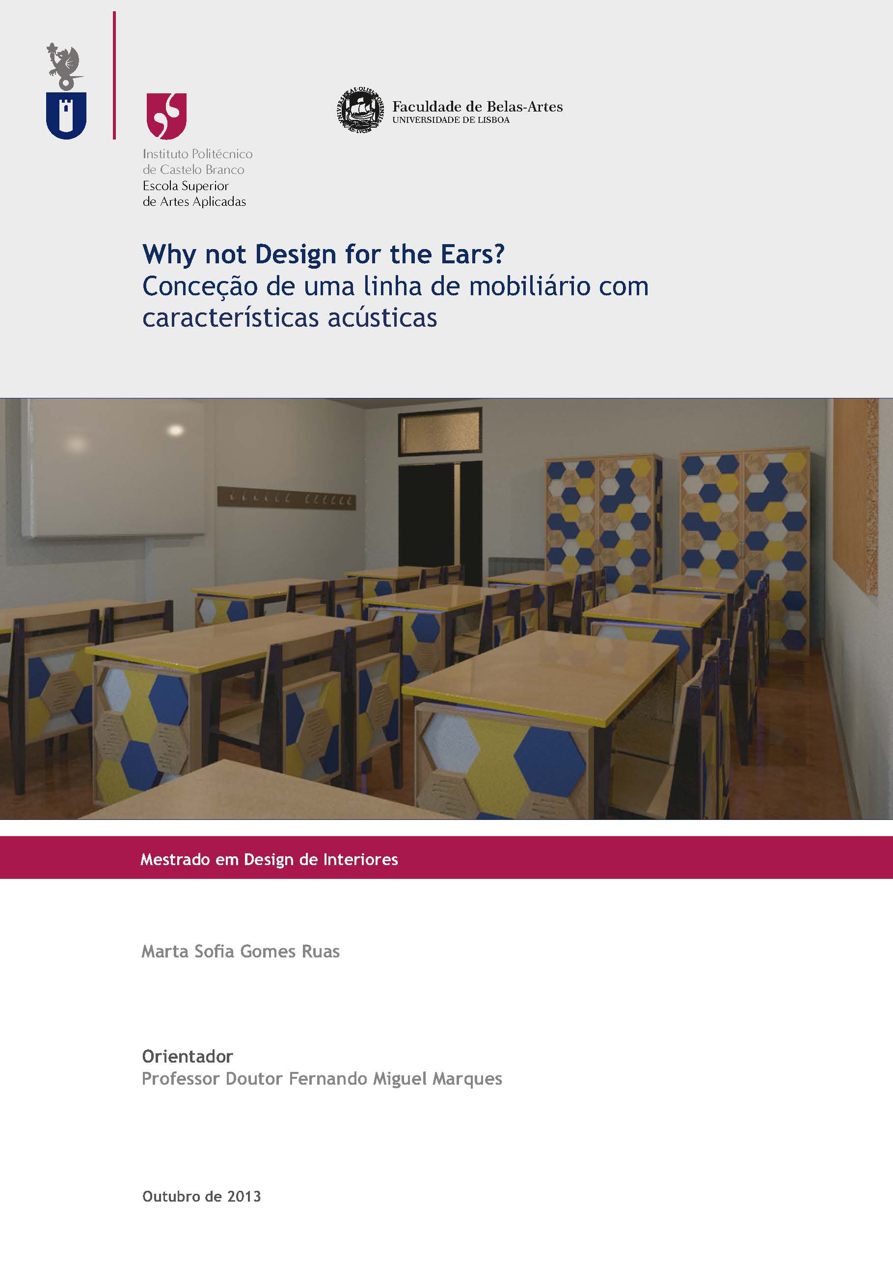 The exposure to noisy environments is a factor that affects not only the wellness, but also other constraints such as health, productivity and communication. In the classroom, this issue isn’t an exception. The interaction between the different actors in the space creates sound sources that interfere with the one that should be the main incentive in a classroom: the teacher’s speech. This research project looks for the resolution of existing problems in the school environment, since 5th to 9th grade, associated with reverberation. Using a methodology of active research, the main objective is investigate if the creation of a new typology of furniture could solve the problem of acoustics in a specific interior space, once the acoustic influences considerably the performance of people in fulfil tasks. Throughout the investigation were examined some cases wherein is demonstrated the importance of the room acoustics, as well as its interference in the environment under study. It’s also studied the current market in the areas of project development, so as emphasizing the relevance of this research. It was found, since then, that the creation of furniture with a new skill – the acoustics – could be a good opportunity for innovation in equipment design. In the practical application of the knowledge acquired, it was considered that it should be designed for the ears and it carries through the investigation and corroboration of this issue. So, it’s intended that in the end of the project it is confirmed that improving the acoustic conditions through furniture it’s possible and it will enhance substantially the conditions of life of its users, particularly teachers and students that are integrated in the school degrees approached