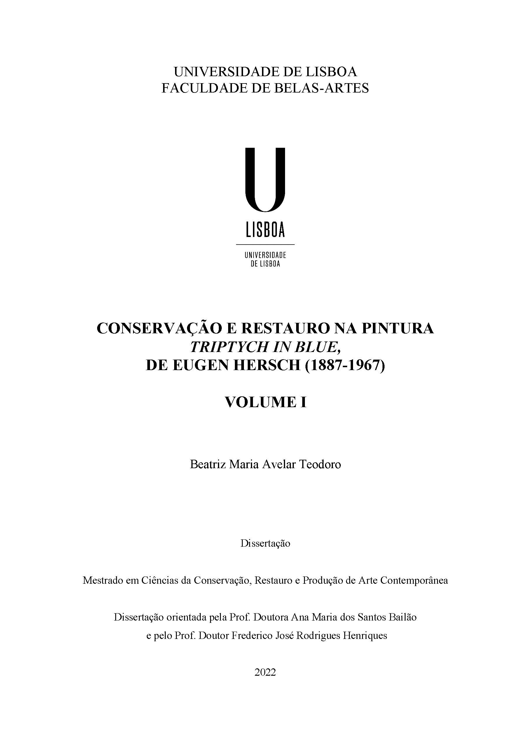 The present dissertation, entitled Conservation and Restoration in the Triptych in Blue Painting, by Eugen Hersch (1887-1967), arises in the context of the Masters in Conservation Sciences, Restoration and Contemporary Art Production. The dissertation has as general objectives the technical and material study of the work and the realization of a conservation and restoration intervention. The opportunity to intervene arose in the summer of 2021, in situ, due to the risk of detachment of the pictorial layer of the central painting of the triptych, the colour changes caused by previous treatments, and the yellowing of the protective layer of the metallic foil. The painting entitled Triptych in Blue consists of three paintings and three predellas, all with representations of human figures. It presents a mixed technique on canvas and plywood, with maximum dimensions of 4 m high, 6 m long and 0,06 m thick. It is privately owned, acquired in 2009, and underwent another intervention between 2012 and 2013. The study focuses on the particularities of the work. Among the specific objectives were: to create a management system for acquired information based on geographic information technologies; understand the relationship between the techniques of mural painting and on canvas applied by Hersch in this triptych; look for solutions to fill gaps, namely in the chromatic reintegration process, and ways to evaluate and validate the result. To fulfil the objectives, different research tools were implemented: bibliographic research; interviews with professionals in conservation and restoration; technical and material study, through examination and analysis techniques; making models that allowed understanding the artist's technique and testing different filling materials for the intervention; and, finally, documentation techniques with photogrammetry were used to acquire digital surface models, produce orthophotographs and use a geographic information system for mapping and spatial characterization of the pictorial surface