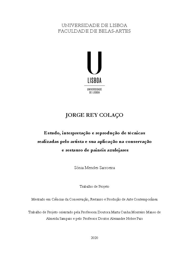 The work developed throughout this project involves the study and the intervention done on fifteen tile panels by Jorge Rey Colaço (1868-1942), created in the first half of the 20th Century and which belong to the collection of the Museu Nacional do Azulejo (MNAZ) (National Tile Museum) in Lisbon. The panels display several motifs and production techniques revealing the artist’s creativity, technical knowledge and aesthetic perception. The project includes the conservation and restoration intervention on the set of tiles, including the production of replicas to compensate for missing elements, with the aim to integrate the panels in an exhibition of the Museu Nacional do Azulejo which has been on exhibit since November 2019. After making photographic and graphic records of each panel with a detailed analysis of their state of conservation, all mortar was removed from the back of the tiles. Then, the tile faces were cleaned, followed by the consolidation of the tile glazing and clay. Broken pieces were glued, gaps were filled and glaze was applied proceeded by chromatic and pictorial reintegration. A visual examination which included the use of a binocular stereoscope to record images was done, as well as an elemental analysis using the technique of energy dispersive micro X-ray fluorescence spectroscopy (μEDXRF). This procedure enabled us to characterize the pigments present in the glaze and the ceramic paste. Transparent lead glaze was identified, along with grit and terracotta, and the use of different metallic oxide pigments and differentiated firing temperatures. This study also includes research on the production techniques used and the graphic sources which originated each tile theme. The aim of this project is to produce the missing elements of the set of tiles, saving the identity of the pieces regarding art and cultural heritage conservation and restoration ethics, respecting the criteria of the Museu Nacional do Azulejo.The entire process developed in the workshop is described in this report. It specifies the tests used for pastes, colours and glaze which, together with the previous study, aided in the choice of the materials and a methodology for reproducing tiles to properly fit in the different panels.Finally, the panels are presented in the exhibition “Jorge Colaço and the figurative tiles of his time” and in the showcases which summarize and show the different restoration techniques applied. The exhibition is open to the public in the temporary exhibition hall of the Museu Nacional do Azulejo (MNAZ).