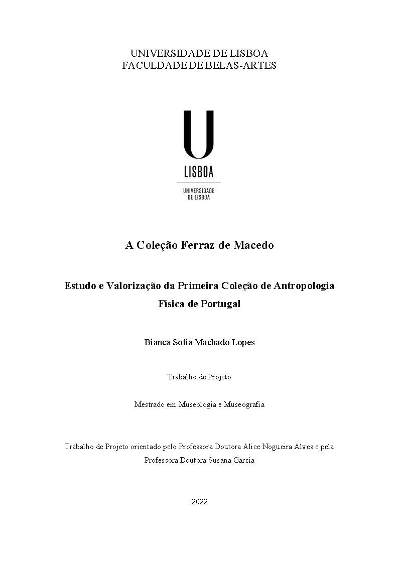 This project work focuses on the study and valorization of the Ferraz de Macedo Physical Anthropology Collection, included in the National Museum of Natural History and Science. This collection brings together about 53 complete and incomplete skulls, having undergone several changes since it was collected until the present day. Ferraz de Macedo lived between 1845 and 1907 (62 years) and dedicated his life to cultivating himself, studying various subjects, among which he ended up developing a special taste for Physical Anthropology. Influenced by the main anthropologists of the time, he dedicated his studies to conducting cranial measurements, to refute the theory that cranial size determined whether the individual had criminal inclinations. After gathering a large number of measurements, he was able to prove that the theory was false. Thus, the first physical anthropology collection in Portugal was born. The oldest descriptions say that this collection came to have around 1000 skulls and 300 skeletons. However, after more than 100 years and a great fire, what remains is a much smaller number, counting today with 53 skulls and no skeleton. With the intention of studying and valuing the collection, an internship was carried out in which the inventory of the collection was done, as well as an analysis of the state of conservation of the mortal remains, a detailed description, and a photographic survey of the present individuals. As a result, the history of the Ferraz de Macedo collection is presented, and the context lived by the identified individuals is revealed, thanks to the original book by its author, Taboas Antropometricas (Anthropometric Tables), in which is possible to find essential information. With this work, it was possible to study and value this collection with due dignity, as it is the first Physical Anthropology collection in Portugal, which still has treasures of considerable importance to be discovered