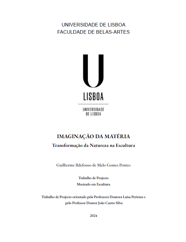 In this Project Work, the sculptural interpretation explores the ability to transmute matter and reconfigure the perception of the materiality of nature itself. Through the transformation of materials, the work reimagines natural elements such as rocks and trees into new sculptural forms. The Project Work attributes a re-signification and expansion of boundaries between the natural and the intentional. The sculptures are based on the essence of matter and the foundation of imagination in sculptural creation. The theme “Imaginação da Matéria” (Imagination of Matter) is the discursive component that underpins and theorises the Project Work. In sculptural practice, steel is chosen as the discursive element that equates matter as a whole from the expressiveness of natural elements, re-evaluating the evolution of raw matter into material and vice versa through sculptural interpretation. It is divided into three moments: “Como Outra Matéria” (Like Other Matter) sculptural series that expresses a re-signification of the materiality of natural elements. “As Pedras Também Respiram” (The Stones Also Breathe) sculptures that question the purpose of the porosity of rocky elements by equating it to the behavior of a tree's bark. “As Árvores Também Erodem” (Trees Also Erode) Interpretation that refers to the organicity of the rough surface of tree bark, relativising the natural behavior of materiality through the process of weathering