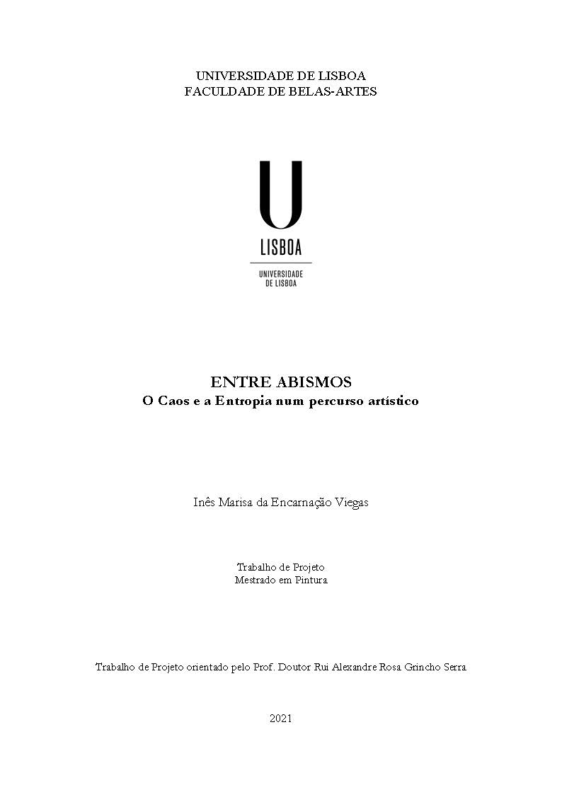 This work project aims to develop a study based on the observation, contemplation and interpretation of destructive and catastrophic processes, in the resulting evolution of Entropy, and the Abyss, making it possible to capture singular moments and perspectives, which may represent, from the artistic point of view, Chaos. It’s also intended to look at the theme of Chaos, Entropy and Abyss from other perspectives, which may complement a strict approach from an artistic vision, framing it in a multifaceted, philosophical, moral, religious and, ultimately, scientific way. Examples of artists and their works, representing an aesthetic approach to the proposed theme, are included as examples of complementarity or even counterpoint, relative to the set of my own art works, developed over the past few years and related to the topics covered.