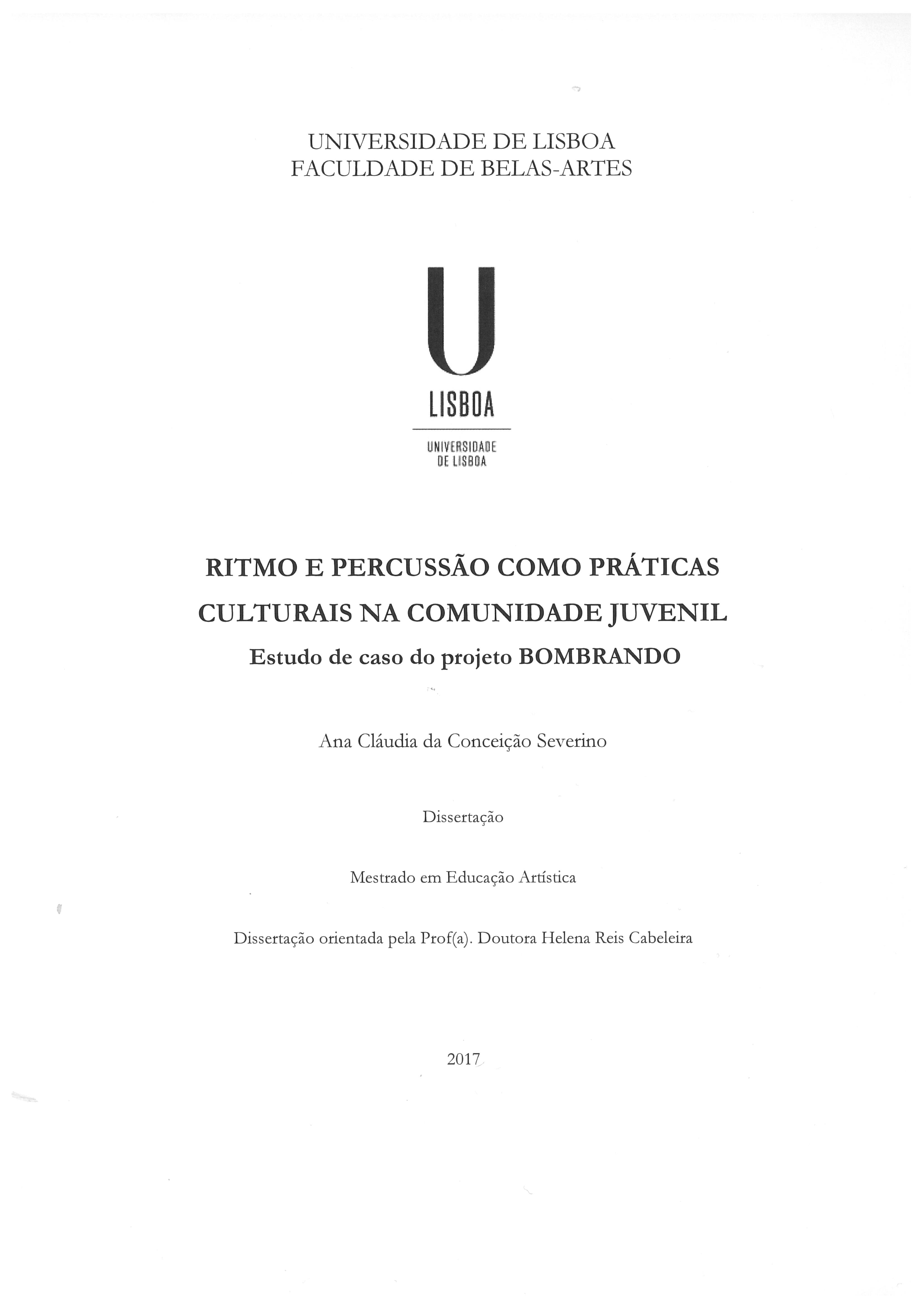 Rhythm and percussion as cultural practices in the youthfull community: a case study of BOMBRANDO project, it's an investigation on artistic education which proposes a study (auto) ethnographic centered either on experiences and reports of the investigator as an integral member of a group of percussion, both in testimonies of the protagonists (direct and indirect) of this musical-community project, based in the Parish Council of Encosta do Sol for more than a decade. From the exploration of the percussive and rhythmic potential of the musical instruments in a context of non-formal learning, we intend to reflect upon (i) the impacts (both individual and collective) of this musical project on the participation and community integration of its members, (ii) the impact of musical instruments in the context of non-formal learning, the situation of this project within the broader framework of cultural and community intervention groups that, through art and music, promote the development of skills and capacities in the youthfull community. For this purpose, a review of the literature on the role and importance of music in community education was carried out, interviews were conducted with members of the BOMBRANDO project, in order to determine the extent to which participation in this project contributed to their formation artistic and performative, as well as for the development of individual, group, social, cognitive and cultural capacities and competences. In summary, it was sought to understand the impact of this artistic-community project in the daily life and in the professional context of the young members of the project. Starting from the educational premise that defends the individual and collective benefits of 'learn music, making music', is intended to demonstrate with this investigation that BOMBRANDO percussion group is a concrete example of a musical, social and community education whose impacts 'real' in people's lives goes far beyond merely non-formal learning or acquisition of 'amateur' musical technical skills through the rhythm and drumming of percussion