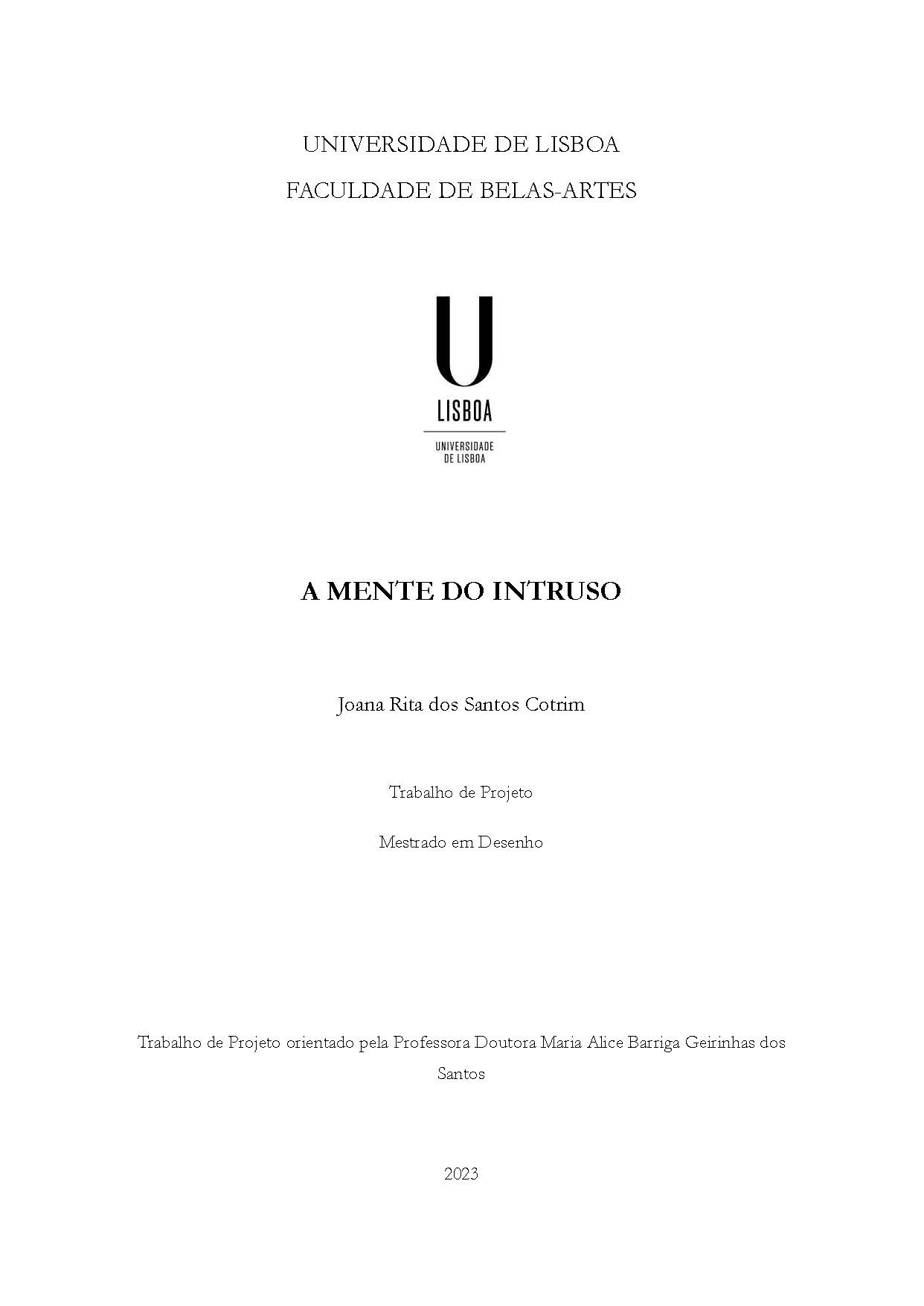 This project The Intruder’s Mind is a retrospective of my academic journey as an art student. It is divided into three parts; starting with the theoretical part of the genre of the individuality of the autobiographical self, with reference to the theorists Lejeune, De Man and Barthes, and then exploring three case studies of artists, Tracey Emin, Christian Boltanski and William Kentridge, who approach autobiography in their artistic process. Finally, with The Intruder’s Mind project, I present my own case study — Joana Cotrim's autobiography —, with the revelation of three drawing series, in the visual representation of the fragmentation of individual and collective memory.