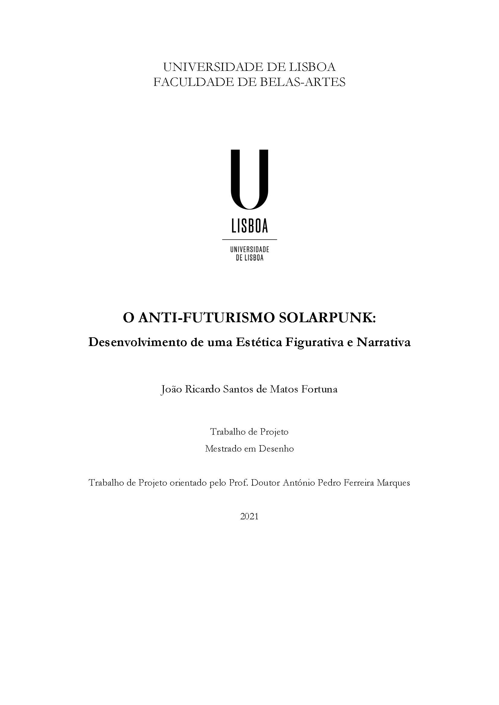 The Anti-Futurism of Solarpunk: Development of a Figurative and Narrative Aesthetic, investigates and analyses a sub-genre of literary and graphic fiction, known for its strong beliefs in ecological action, in hopes of creating an original aesthetic that aligns with its themes and narratives. The first part is dedicated to the current definition of solarpunk, how it distinguishes itself and navigates amongst similar narrative genres. Particularly, we will be considering its relationship with the concept of utopia and work towards demystifying it, starting with the book that originated the term, its contemporary understanding and how it was built upon the social-religious myth, ending with its disassociation and recontextualization within the sub-genre. In the history of fiction, the current of solarpunk is new in comparison with other genres but its arrival was not represented by a single and characteristic piece of work. Humanity’s relationship with nature is as old as our existence but our efforts in preserving it are highly dependent on the cultural geography and time, and therefore its analysis is crucial to understand how society separated itself mentally from the ecosystem. In the occident, humans have been telling stories dedicated to the appreciation of nature and other humanistic values since the end of the XVIIIth century, making Romantism a counter-culture affirmation that contrasts with the beginning of the industrial revolution, distinguishing itself as the progenitor of a new way of thinking and the start of an art movement with long standing ramifications in art, society and the eventual ecological stories of the XXth century, directly related to the birth of solarpunk This research showcases the parallelism between it and our current situation, which is on a global scale. This thematic relationship guides us to the second part, the analysis of other artistic movements, equally relevant to the birth of the subject matter, specifically Realism, Impressionism and Art-Nouveau (Modern-Style, Tiffany-Style). Each of these movements contains germinating parts that constitute solarpunk’s identity and where it stands thematic and aesthetically. The third part represents the project component of this dissertation, made up of the analysis of what we understand are the most relevant visual elements brought from Futurism, to create a new thematically opposing aesthetic. This entails its representation of movement and how it was transposed to animation and comic books/graphic novels, finishing with an understanding of what the Anti-Futuristic Solarpunk aesthetic represents and ending with its demonstration through six original illustrations.