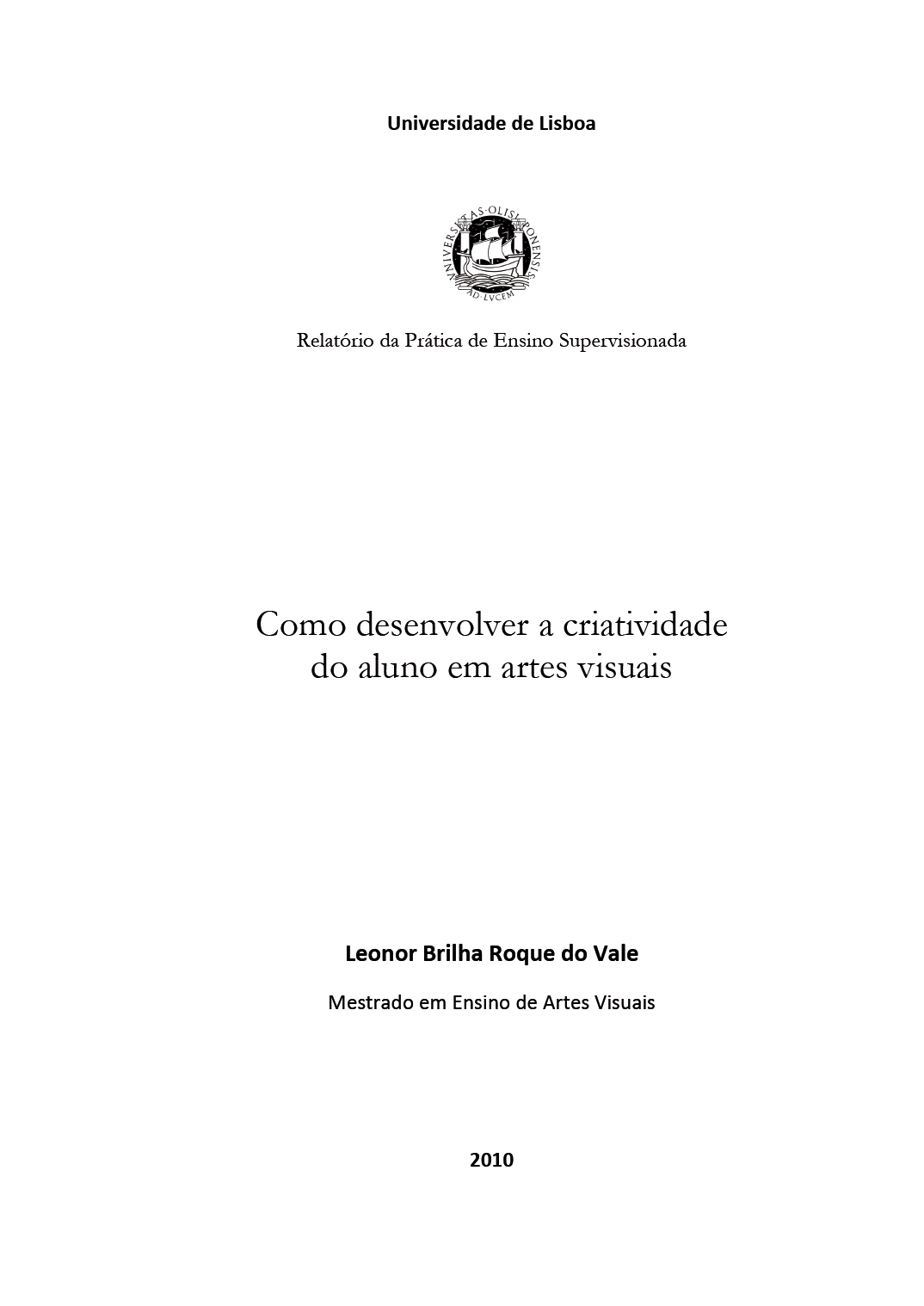 emergence of Art in Education, as the genesis of Visual Education as a curricular subject in the Portuguese teaching process; then follows the specific Creativity – its concept, origin and definition, its involvement in teaching – as an essential competence to be developed in Visual Arts Teaching process and in everybody’s life. This stage is important considering the strategies for the development of creativity of the student which will be delineated in the classroom daily life. The second stage includes the report of the process of my practical work developed in the teaching of Visual Arts to the 8th year in School ‘E. B. 2.3.’ in Loures, under the supervision of the